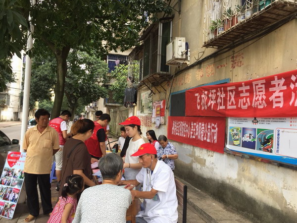 ? 本網訊? 8月17日上午,水北街道飛機坪社區聯合水北社區衛生服務中心的志愿者在轄區內開展宣傳及義診服務進社區活動。活動通過在社區設立咨詢臺、發放宣傳單等形式,向群眾宣傳計生衛生政策、黨的十九大精神、掃黑除惡知識、廉政文化知識等?,F場發放宣傳單200余份。水北社區衛生服務中心的志愿者為過往群眾測量血壓,講解如何預防高血壓、冠心病、糖尿病等知識,提倡控油低鹽,加強鍛煉等健康生活方式。活動得到群眾的一致好評,取得了良好的社會效果。(黎艷)