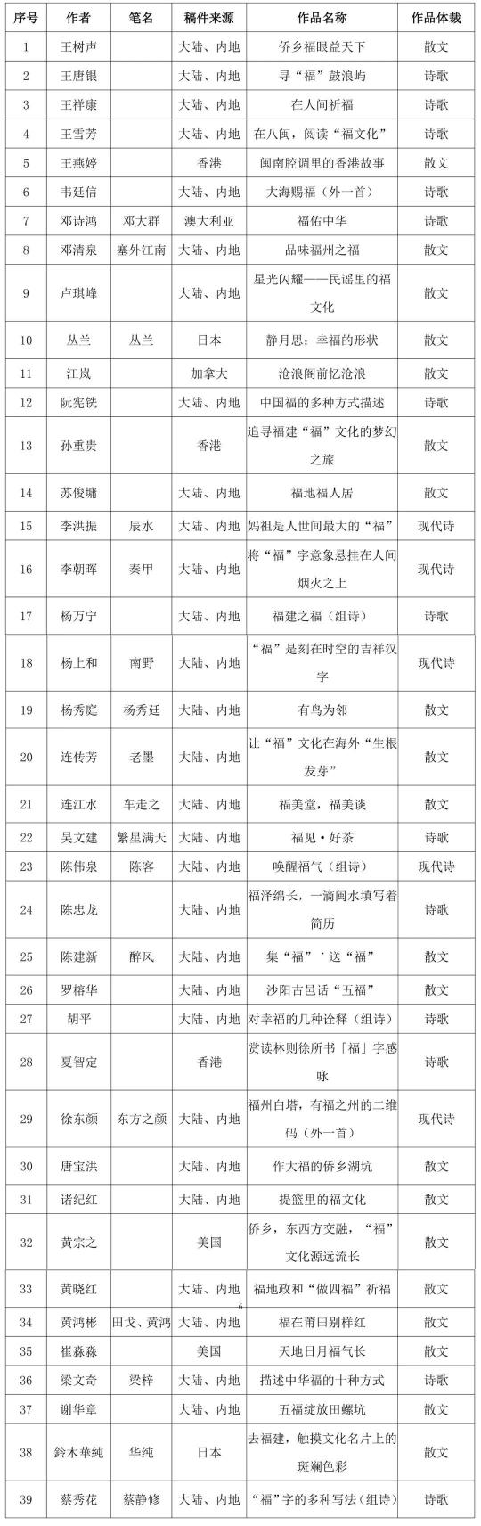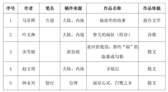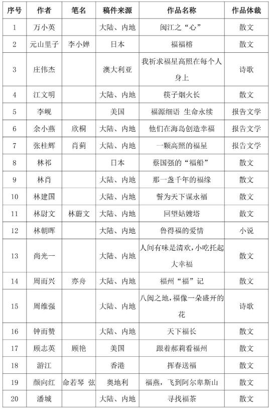 由福建省文學藝術界聯合會、福建省歸國華僑聯合會、福建省對外文化交流協會、福建省作家協會、學習強國福建學習平臺、福建文學雜志社、福建省文藝評論家協會聯合舉辦的“中華福·福天下”全球華語征文活動經過作品征集、評選、公示,并報省文聯黨組審批通過,最終評選出一等獎5篇,二等獎20篇,三等獎35篇,入圍獎39篇。現將結果公布如下: