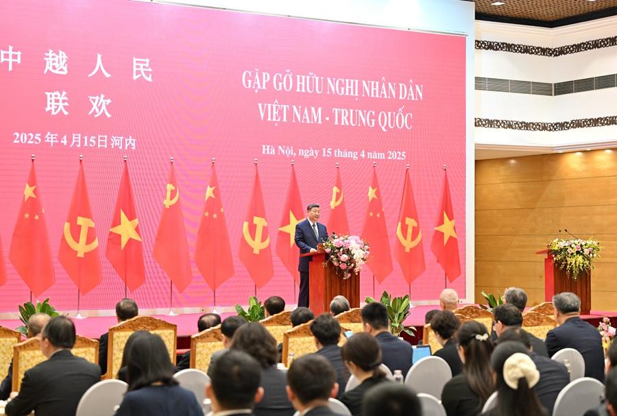 ??4月15日上午,中共中央總書記、國家主席習近平在河內國際會議中心同越共中央總書記蘇林、越南國家主席梁強共同會見中越人民大聯歡活動代表。這是習近平發表題為《奏響睦鄰友好主旋律 共譜命運與共新篇章》的致辭。新華社記者 申宏 攝 新華社河內4月15日電(記者郝薇薇 蔣超)4月15日上午,中共中央總書記、國家主席習近平在河內國際會議中心同越共中央總書記蘇林、越南國家主席梁強共同會見中越人民大聯歡活動代表。 兩黨兩國領導人共同步入會場時,中越各界友好人士熱烈鼓掌。 習近平發表題為《奏響睦鄰友好主旋律 共譜命運與共新篇章》的致辭。 習近平向出席活動的兩國代表致以誠摯問候。習近平指出,中越關系根基在人民、血脈在人民、力量在人民。長期以來,從攜手救亡圖存播下革命火種,到并肩戰斗實現國家獨立和民族解放,再到共同邁上現代化征程,中越兩國人民始終風雨同舟、休戚與共,共同書寫了中越友好歷史篇章。