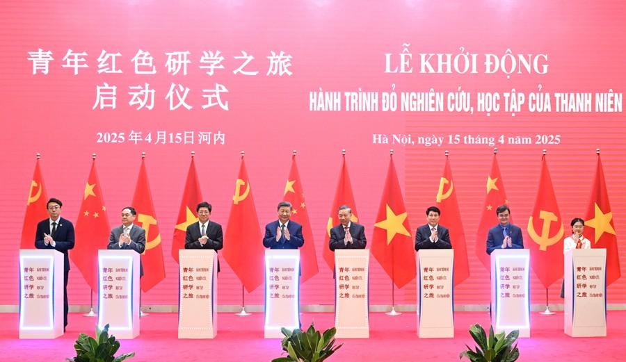 ??4月15日上午,中共中央總書記、國家主席習近平在河內國際會議中心同越共中央總書記蘇林、越南國家主席梁強共同會見中越人民大聯歡活動代表。這是活動后,習近平和蘇林、梁強共同啟動“紅色研學之旅”項目。新華社記者 申宏 攝