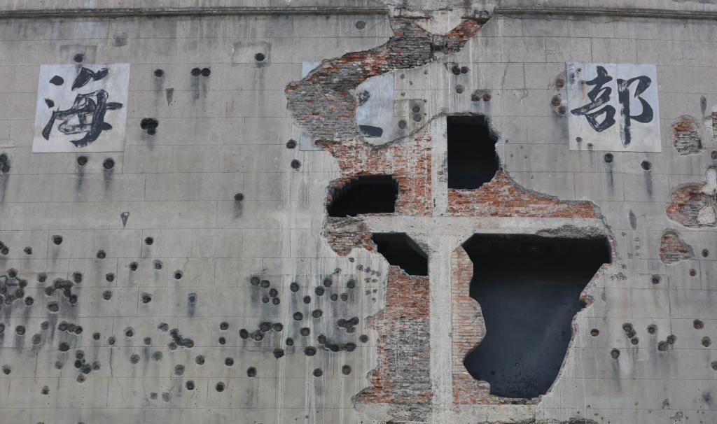 ??這是四行倉庫西墻上的炮彈孔和槍彈孔(2021年9月17日攝)。新華社記者 王翔 攝