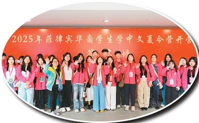 2025年菲律賓華裔學生學中文夏令營部分營員在開營式現場合影。朱 婷攝